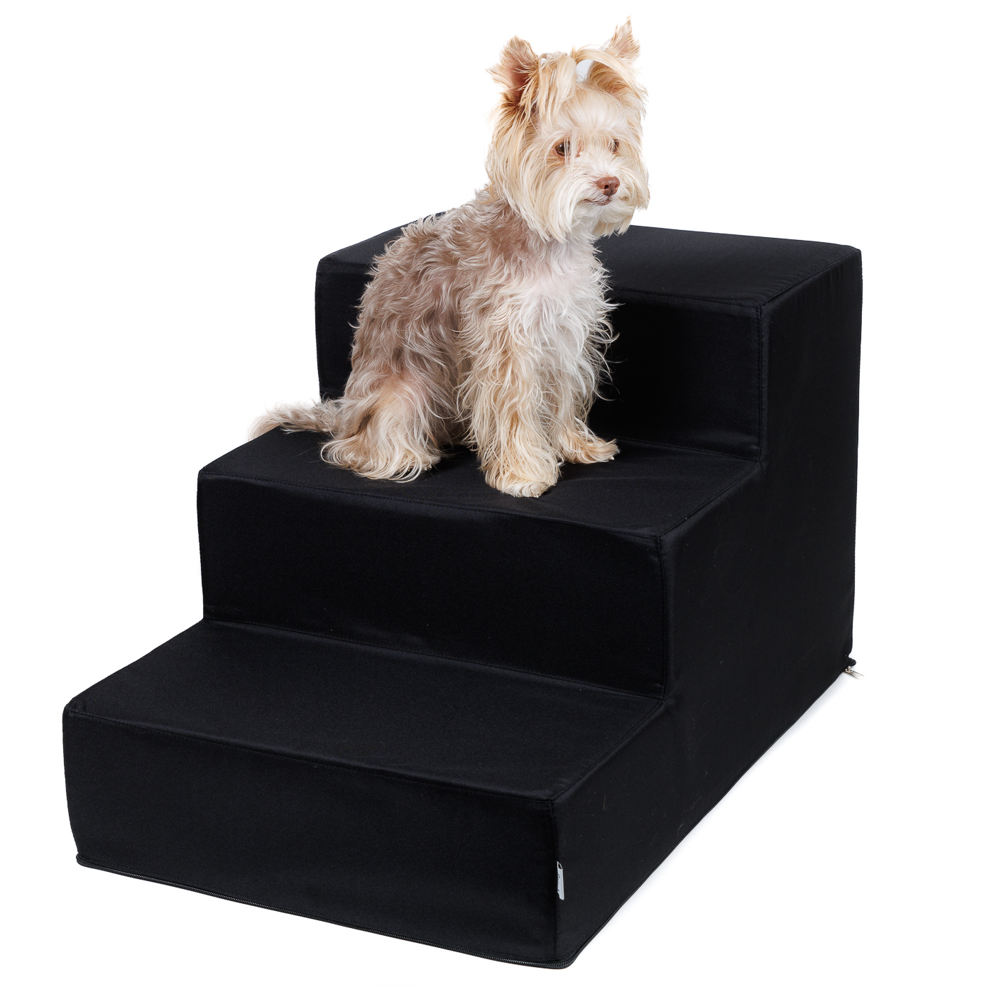 Jádro schodů tvoří tuhá PUR pěna, která poskytuje pevnou oporu pro nohy psa. Vrchní materiál je z odolné batohoviny v černé barvě . Díky snímatelnému potahu na zip jsou snadno udržovatelné a praní v pračce je možné při 30°C. Tyto schůdky vyrábíme u nás v České republice v naši dílně v rozměrech v42 x š45 x d70 cm. Nabízíme možnost dokoupení náhradních potahů, aby bylo možné změnit design.